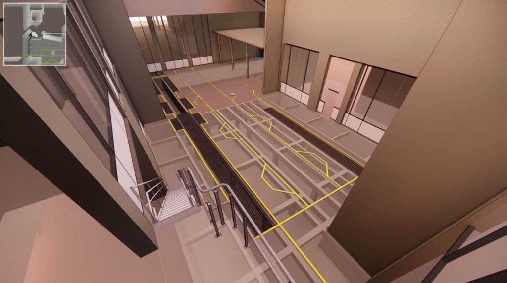 niveau 0 repose sur un remblai compacté et non plus sur la structure centenaire. Une gaine technique a été conservée tout autour de la zone remblayée pour maintenir le passage des conduites. Une mise à niveau du système d’évacuation des eaux a également été réalisée dans le périmètre d’intervention.