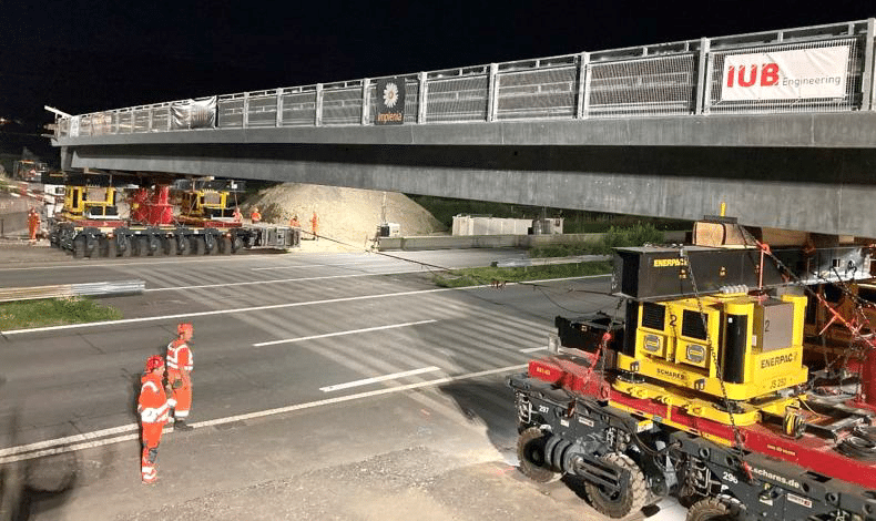 Le tablier a été intégralement préfabriqué sur site et mis en place lors d’une opération coup de poing à l’aide de chariots SPMT. Au stade définitif, le tablier est encastré dans les culées en béton armé, fondées sur des pieux forés. L’ouvrage fonctionne à la manière d’un pont cadre intégral. Une surcouche de CFUP armé de